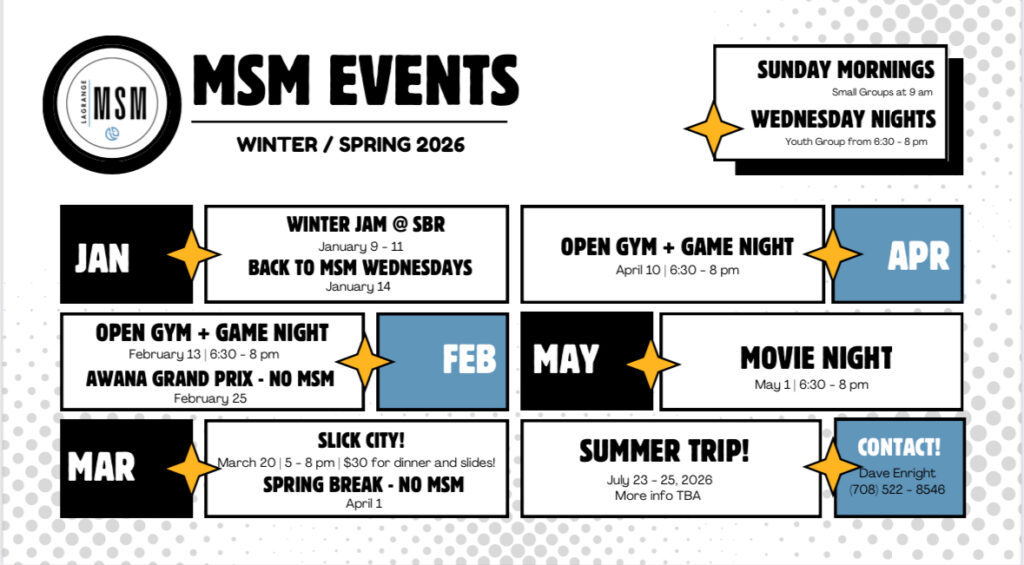 - Middle School Youth Group, Wednesdays @ 6:30PM (Sep-May)